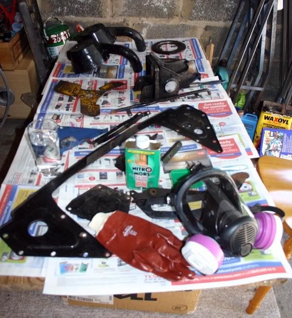 I spent the day stripping the metal items from the engine bay with Nitromors and elbow grease. Cat's father has a sand blasting cabinet and has kindly offered to tidy them up for me but the caked-on Hammerite was best stripped off before hand.