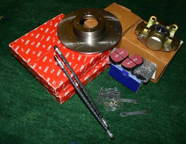 In the meantime I've been dismantlling the front braking components. I'd planned to refurbish the callipers and replace all the perishables but unfortunately even though I'd soaked it in penetrating oil I managed to snap off one of the calliper bleed nipples. An Easy-Out utterly failed to get it out so it began to look like a replacement was the only sensible option. Once I'd compared prices of pads, discs, calipers etc, a deal on eBay at £140 seemed the best value for money, so I bought this little lot: