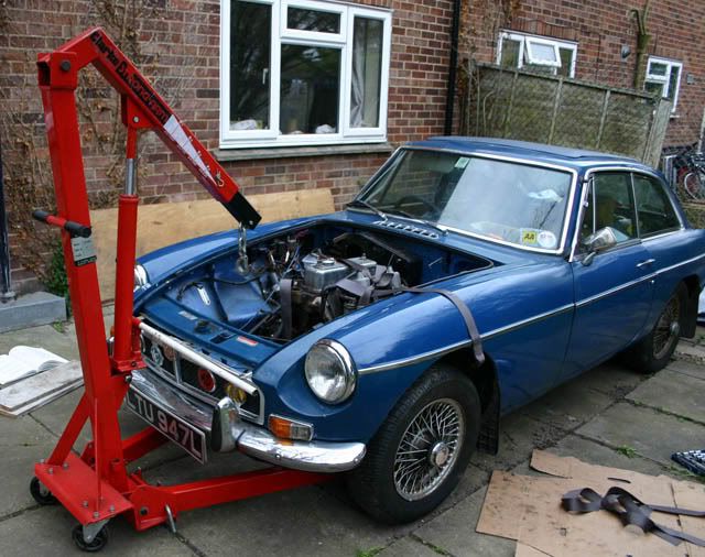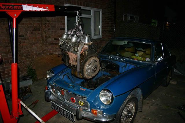 The engine came out a treat - the last one I helped remove was a Jaguar V-12 and I'm pleased to report that there was LOT more room in the MGB's engine bay!