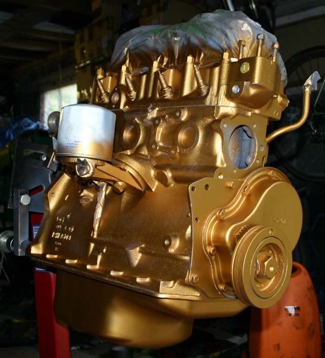 Finally, I spent some time preparing the engine for painting. The first thing to do was to take off the timing gear cover and let the tensioner off so that it can ratchet under oil pressure. Once that was done, I bent the lock tabs on the tensioner retaining bolts, installed the oil thrower and then bolted the cover into place. Finally I installed the pulley, lock ring and bolt. The rest of the time was spent killing the rust on the sump and timing gear cover, then degreasing and pressure-washing the whole engine.