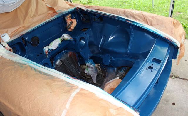 Had quite a productive session on the MG yesterday. I flatted-back the primer and then got two coats of Teal Blue on the engine bay: